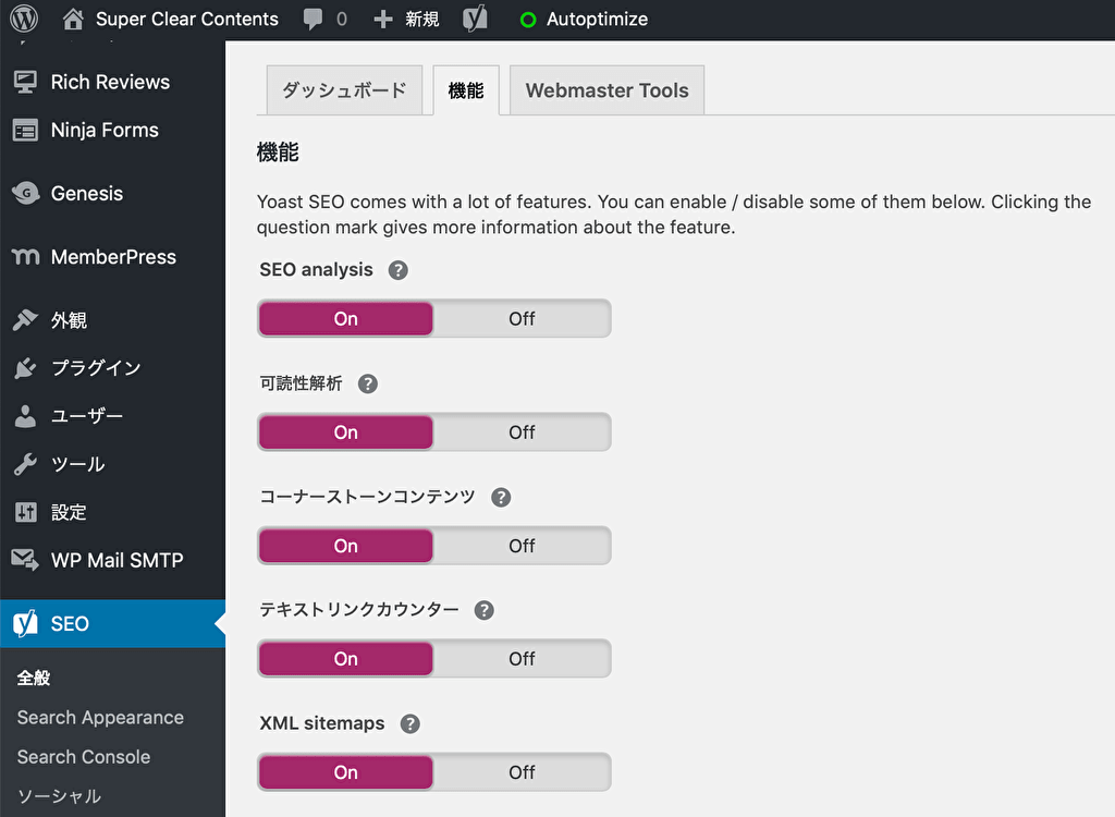 Yoast SEOをインストール後、管理画面を開いて「SEO >> ツール」と選択すると、上の画面のように「ファイルエディタ」という項目が出てきます。ここをクリック…