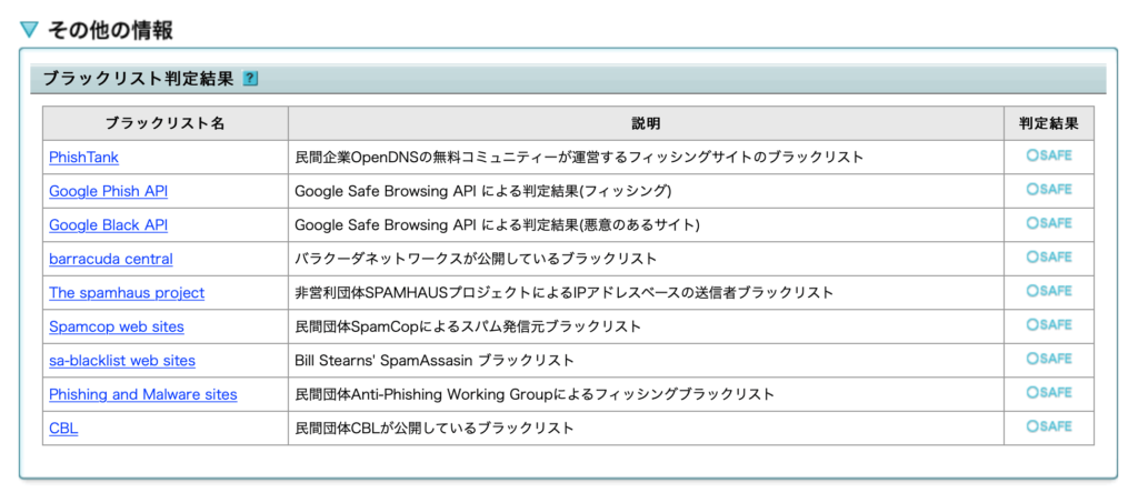 日本語のブラックリストチェックツールなら、例えばaguseというサイトがあります。中央のボックスにドメイン名を入力してクリック…次の画面を下にスクロールしていくと、「ブラックリスト判定結果」という項目があります(下の画像はSuper Clear Contentsのドメイン名をチェックした結果です)。ここの判定結果を参考にして、その中古ドメインの安全性を推測することができます。
